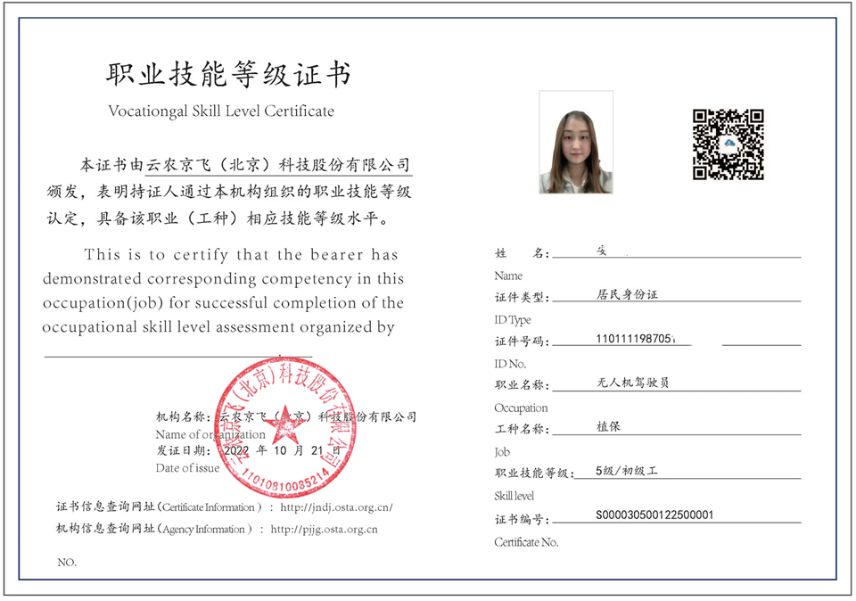 培訓(xùn)合格后,將獲得由云農(nóng)京飛(北京)科技股份有限公司頒發(fā)的“職業(yè)技能等級(jí)培訓(xùn)結(jié)業(yè)證書”。
